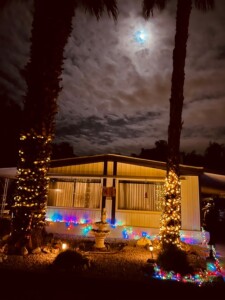 I couldn’t reach the peak even though I had a ladder. I decided instead to wrap lights around the palm trees and let the year-round lights on the trunks shine bright as well. But still, something for the peak would have been nice. And then the moon came out and I had what I desired.