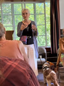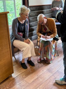 What a joy to see so many of you at events on the North Central Oregon Coast, the site of Across the Crying Sands. Several of you came to venues where poet Dana Huneke-Stone shared the dais with me. I love this photo of Dana signing my copy of her book Amuse-Busche. There was laughter. There were tears. There was applause. Most of all there were readers enjoying the connection with other readers around a story of a remarkable coastal woman, Mary Gerritse. At each site I had friends and helpers including Suzy and Collin Wintjen of Seaside, Kathy Gervasi of Tillamook AAUW and Joe Salsman of the Tillamook library, Liz Scott of the Cannon Beach History and Museum Center, Jen Dixon and Doug of the Cannon Beach library, Alexa and crew at Beach Books in Seaside and friends Gary and Margie Waite who hosted me for a few days in Cannon Beach. At home, granddaughter Mariah looked after Jerry in fine form with the two great-grands making him happy Father’s Day cards while Mariah fixed the broken shower and cleaned the filter on the fridge. She’s amazing. I also fit in a meeting with a 30+ year book group gathered in Forest Grove having read This Road We Traveled. I also participated in Emma’s Day at Granny Fi’s Shortbread and tea House in Aurora where we had a presentation of One Hundred years of Hems from the Ft. Vancouver, WA, costume archives. It was fabulous and helped make for a busy whirlwind eight days. Some of you brought us gifts of Farm Fresh eggs and pear butter, wine, a silk scarf, books and more for which I’m grateful. Most of all I’m grateful for your joyous reception of me, Dana, our books, Rupie and sharing in the joy of community.