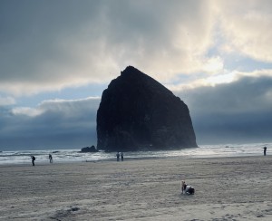 Oh. My. Goodness! I was the star, I know I was, at the book events my mom took me to. People petted me and they oohed and aahed at my soft fur and just meeting me! They’d seen my photographs in my mom’s newsletter and she talks about me on something called podcasts she puts links (sausage?) to on her Facebook author page. People in London have heard of me! At her events, she waves her hands to talk like she does. (She says it’s because she grew up in the Midwest and people there talk with their hands to move bugs away from their mouths.) She held my leash at the same time. I couldn’t even lay down! Fortunately, her friend came and rescued me. You can see how I suffered in the photograph. It’s not my best side. But the real treat was the ocean! I ran with my friend Charlie and then I saw it: a seagull hopping on the sand. I went after him – just to make friends – but he took off and flew toward the top of Haystack Rock. I ran after him when Oh. My. Goodness! I ended up in the sea, waves splashing against me and salt water in my eyes while he screeched and flew away. My mom was screeching too and running toward me. Spitting salt water, I got put on a leash. Again. Maybe next time I’ll catch that gull. Thanks for reading my words. Someone told my mom I might be a rival so don’t be surprised if one month I’m not here to share my wit and wisdom. Naw, she loves me too much. Woof! Woof!