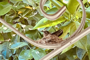 A fourth hummingbird nest has appeared at our little coach in Rancho Mirage. Three other nests with two eggs each have clutched their little families until the juveniles flew off. This one is just outside the slider glass door, beneath a sun awning, on the patio, claiming a spot on the metal loop. I’ve been looking up what hummingbirds in one’s life means. “Joy. Healing. Someone somewhere is thinking kind thoughts about you.” The mythology is lovely. The other day as I walked Rupie, another dog walker came toward me. “Do you know you have a hummingbird following you?” I hadn’t but when I stopped to chat with her, the bird hovered then found a branch to sit on before flying off. Was it one of “our” birds or just one meandering along the trail? We have a high school friend staying here this summer. She’ll keep the feeders filled and give us updates on the status of this family. But as I load the car to head back north to Oregon, it’s a lift to consider that four hummingbird families have found their way to our home. One article I read said that hummingbirds are spiritual messengers. Today I’ll let them represent their hope for traveling mercies as we re-enter the Northwest from the desert.