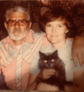 The picture of Jerry and me and John the cat was taken in 1977. I know exactly because of the shirt Jerry’s wearing and the major mis-communication that occurred that October. He had gone hunting six hours north; I had planned a long weekend with friends in Ashland, Oregon four hours south. We kept in touch via a walkie-talkie when each evening his hunting partner would climb a ridge above their camp and call out to his wife, both standing many miles apart, wind often distorting their words. Then Sharon would call me with their status. The message that arrived to me on Friday evening, the first day of my great escape, was that I was to “bring the truck and come now” 10 hours one way distant. I had bought that shirt for him that afternoon in Ashland, but wished at that moment that I hadn’t, gifting him for interrupting my getaway? I had to back to work on Monday which meant I’d be driving all weekend.